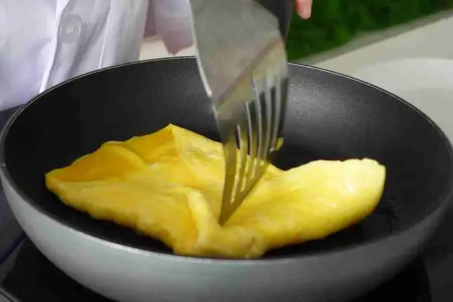 Step 6: Beat the eggs and pour a thin layer into the pan, fold the edges to form a square shape of tamago